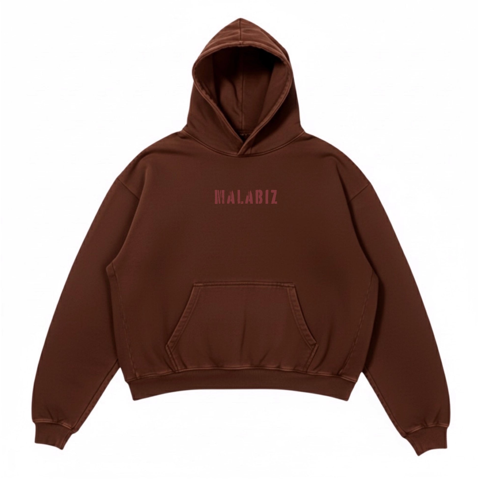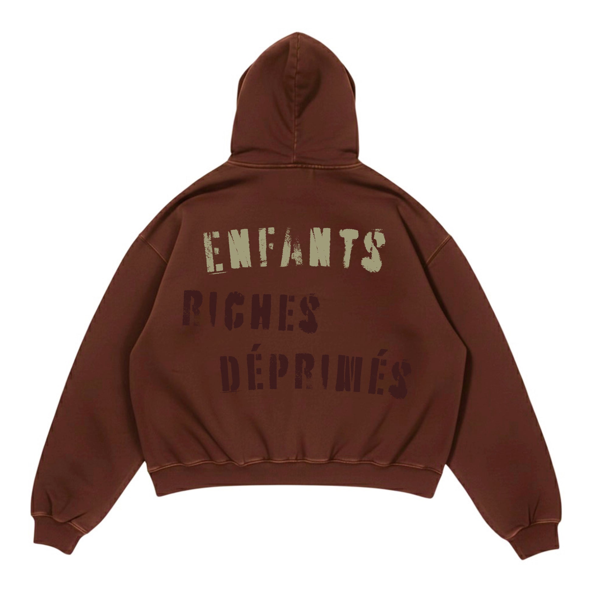 In a rich dark brown shade, this hoodie features “Malabiz” subtly printed on the front for a minimalistic touch. The back showcases the phrase “Enfants Riches Déprimés”, which translates from French to “Depressed Rich Kids.” This phrase brings an edgy, thought-provoking commentary on privilege and emotional depth, making it more than just a hoodie—it’s a conversation starter.