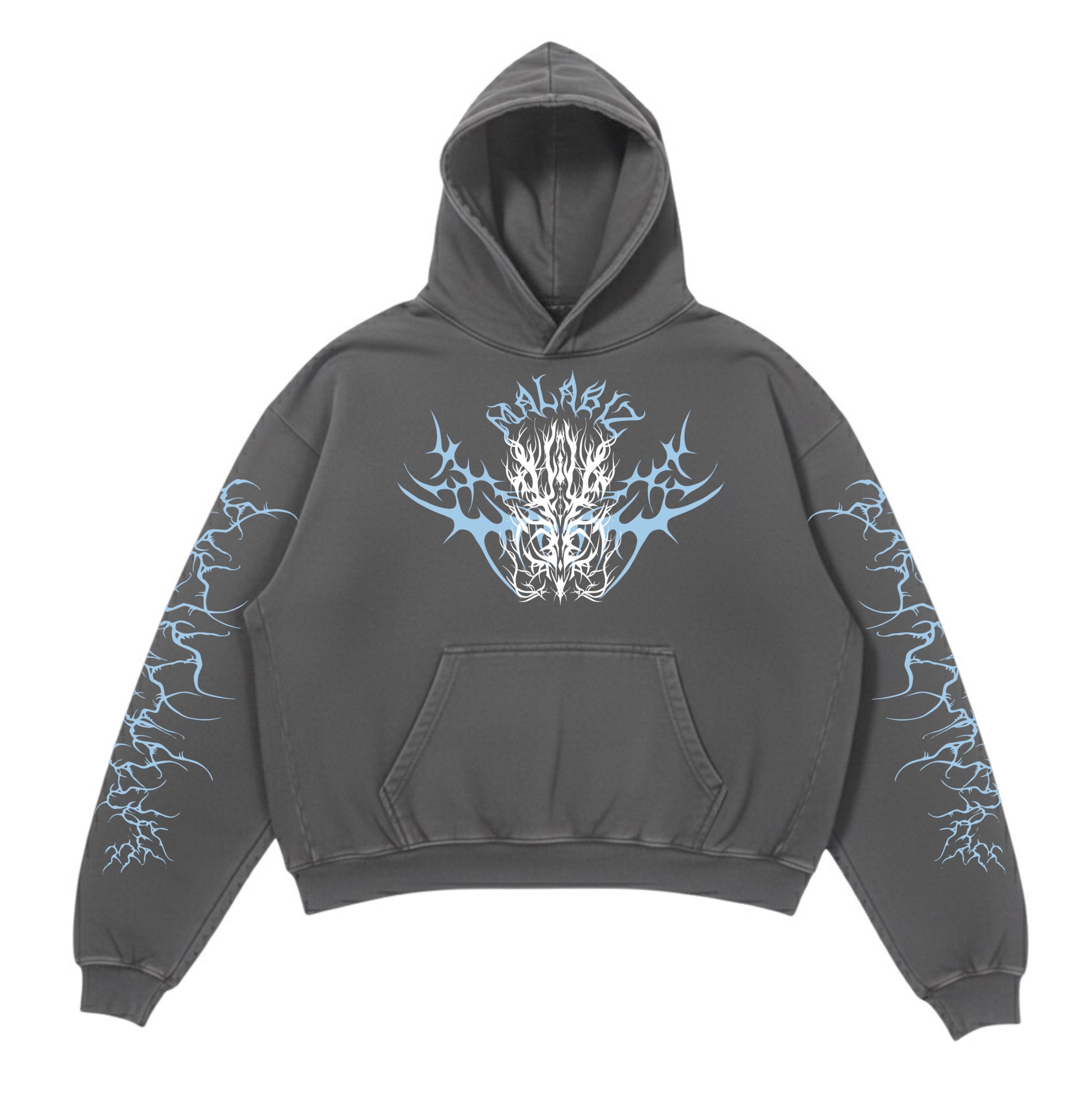 Featuring our brand name, Malabiz, prominently displayed on the front, this striking dark gray (cinder) hoodie showcases a captivating light blue gothic design on both the front and sleeves, adding a unique flair that sets you apart from the crowd.